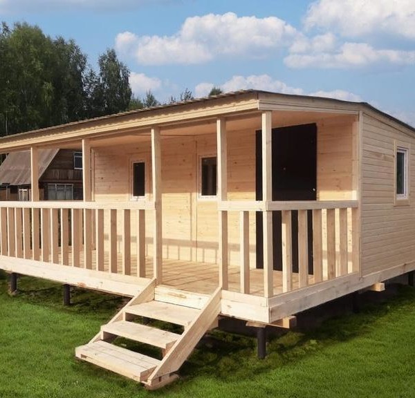 Дачный домик 6х6 с двускатной крышей и верандой в г.о. Егорьевск установлен на сваях, которые приподнимают его над уровнем земли, что помогает защитить конструкцию от влаги и позволяет проветривание нижнего пространства.
