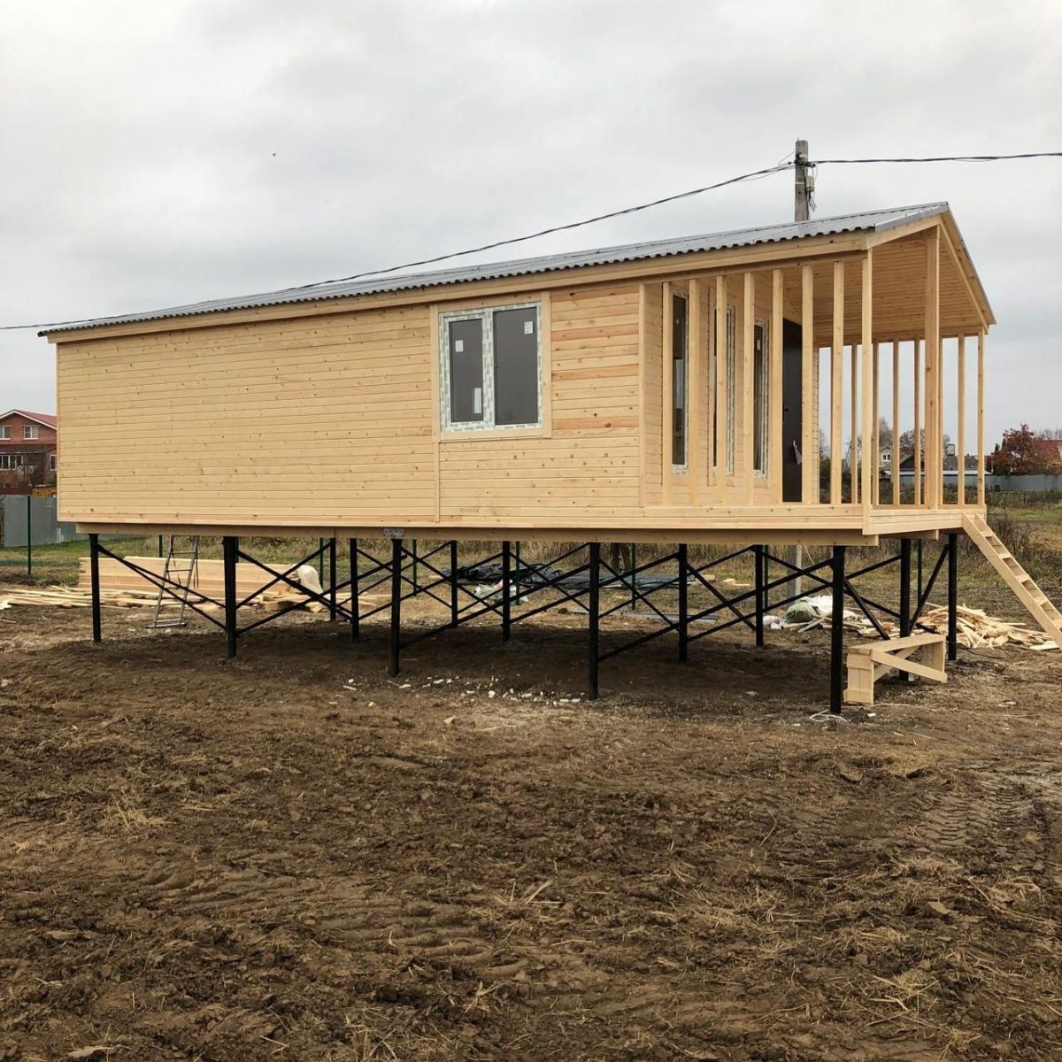 - Дачный домик 10х5 установлен на винтовых сваях, что обеспечивает надежность конструкции на неровной поверхности и защиту от воздействия влаги и холода.