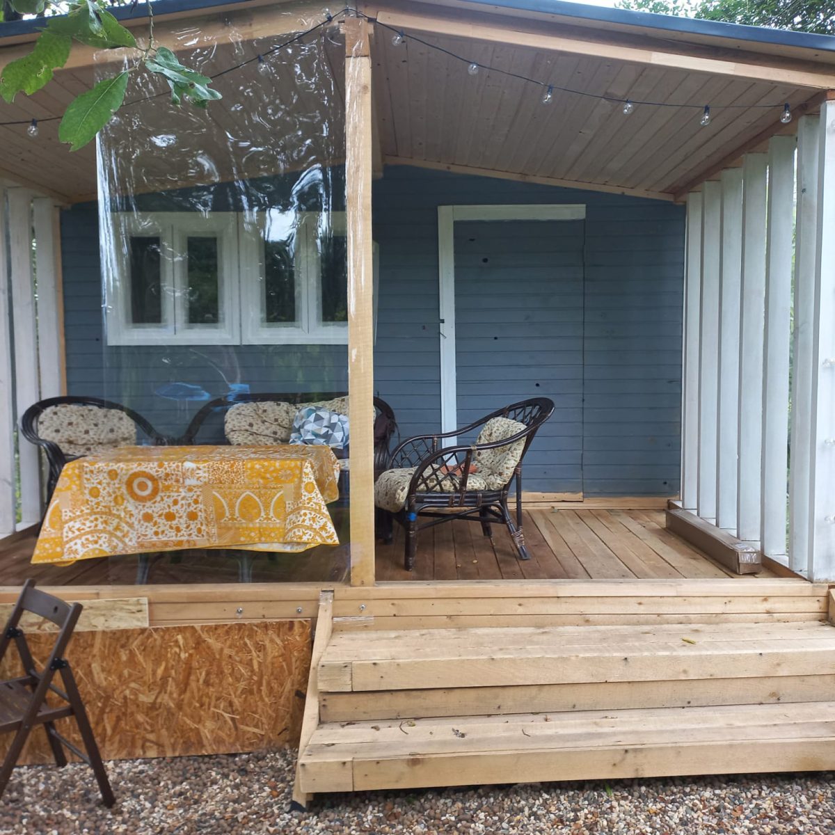 - Общая площадь составляет приблизительно 16 м², что делает данное строение подходящим для временного проживания и отдыха на участке.
