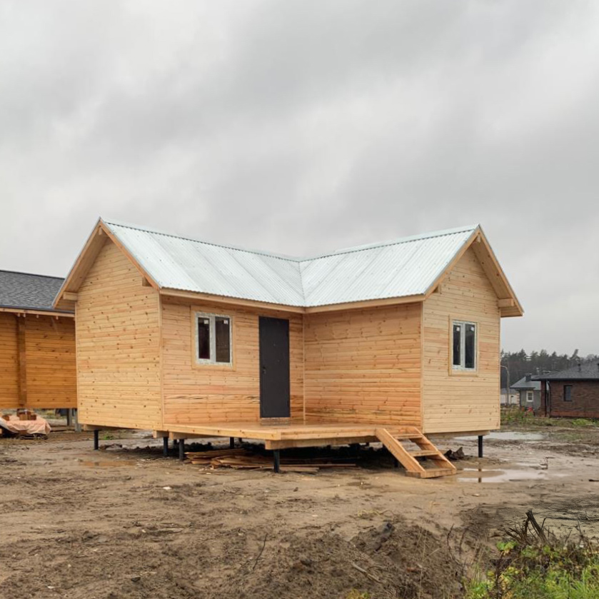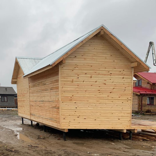 - Угловой дачный домик 7х6х3 в г.о. Балашиха установлен на свайном фундаменте из 12 свай, что гарантирует стабильность на неровных участках земли и защищает от влаги и холода с земли.